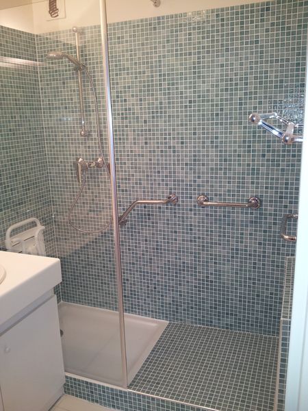 Création d’un coin douche avec siège escamotable, barre de maintien, robinetterie, paroir fixe, carrelage mosaïque type piscine.